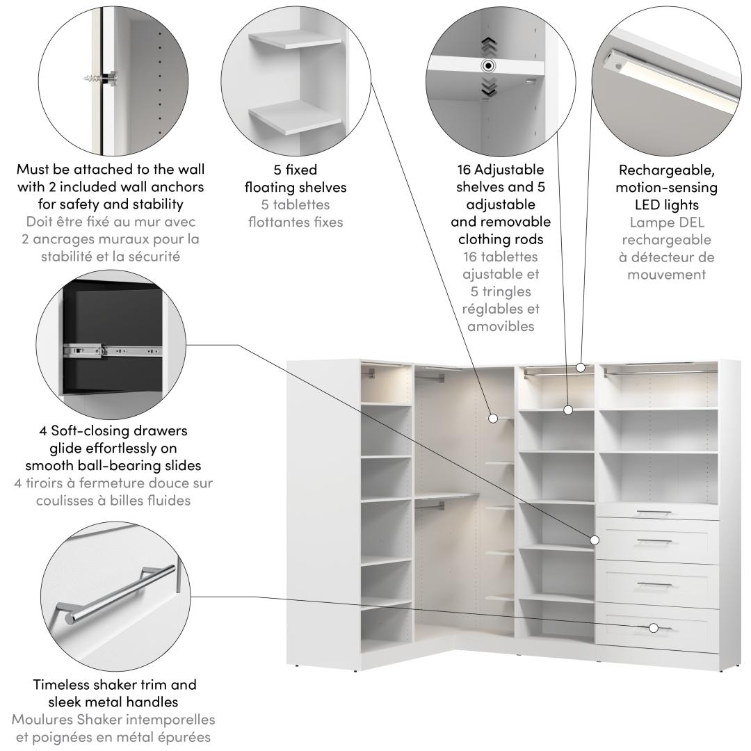 Modular L-Shaped Closet System with Shelves, Drawers, Clothing Rods & LED Lights, Shaker Style, 105W x 61D