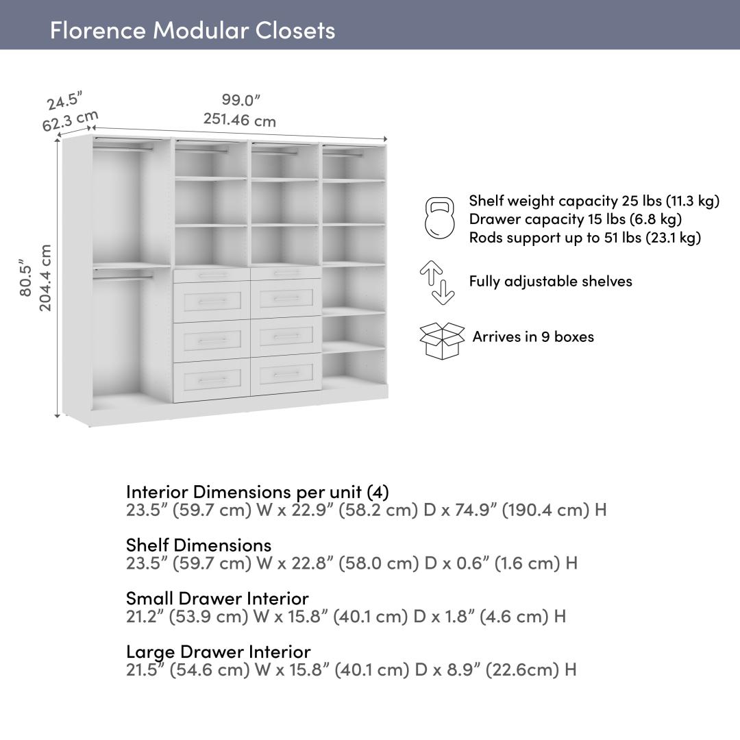 Modular Closet System with Shelves, Drawers, Clothing Rods & LED Lights, Shaker Style, 100W x 25D