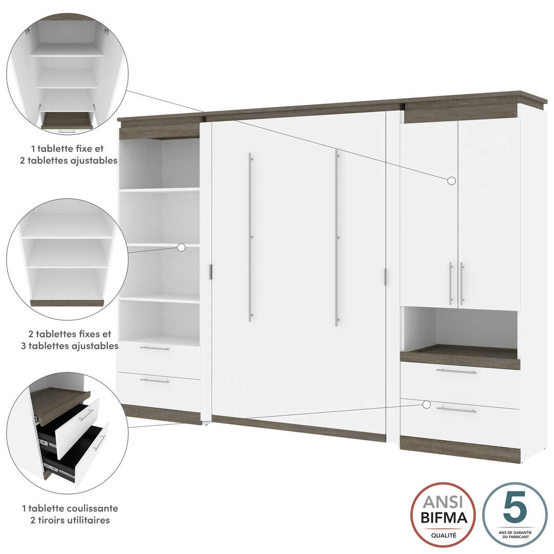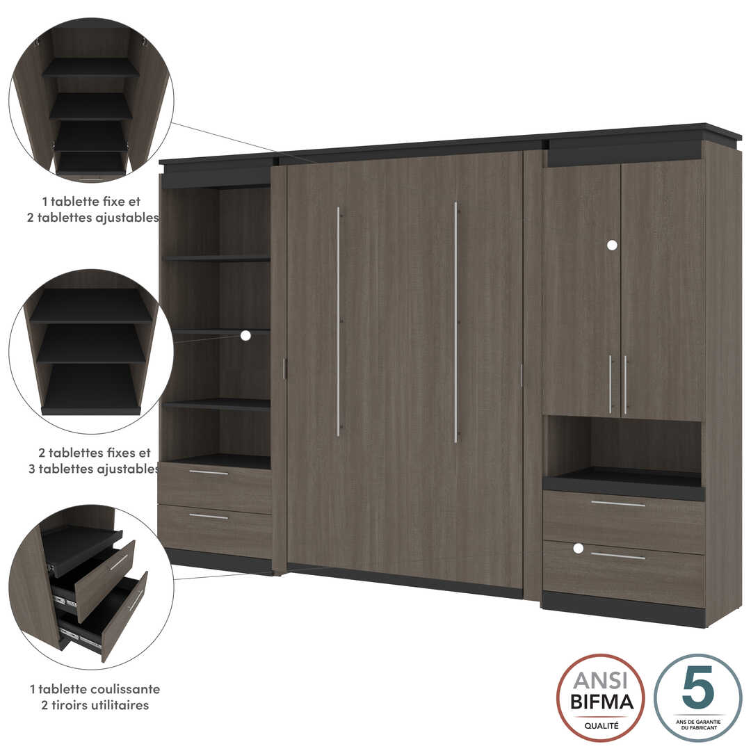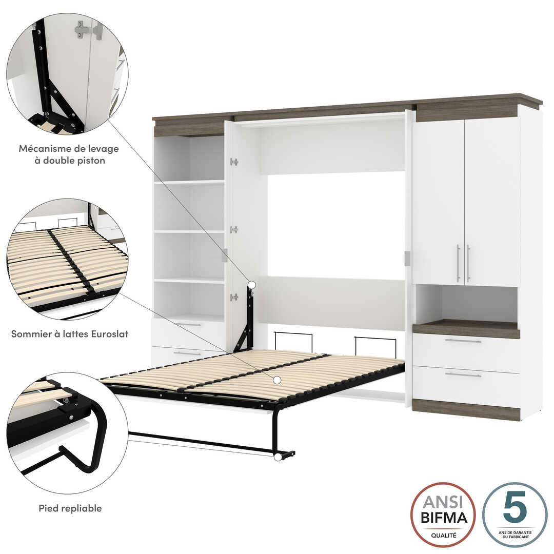 Lit escamotable deux places (double) et rangement multifonctionnel avec tiroirs (119L)