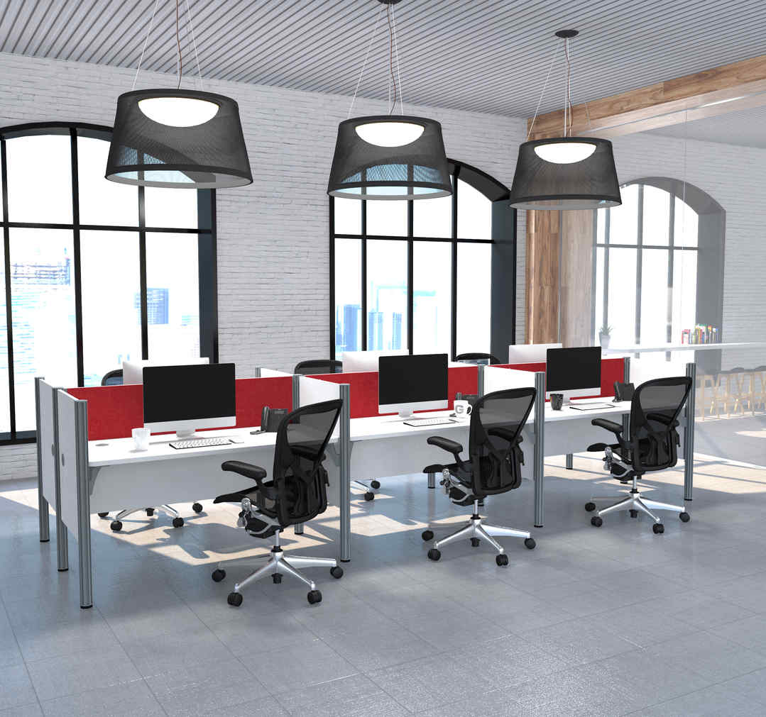 6-Person Office Cubicles with Red Tack Boards and Low Privacy Panels