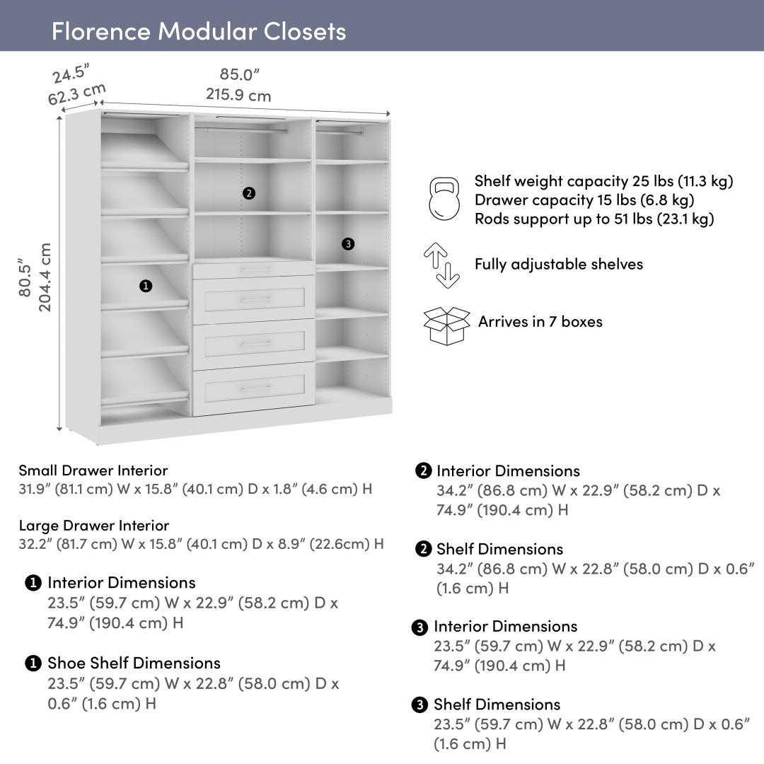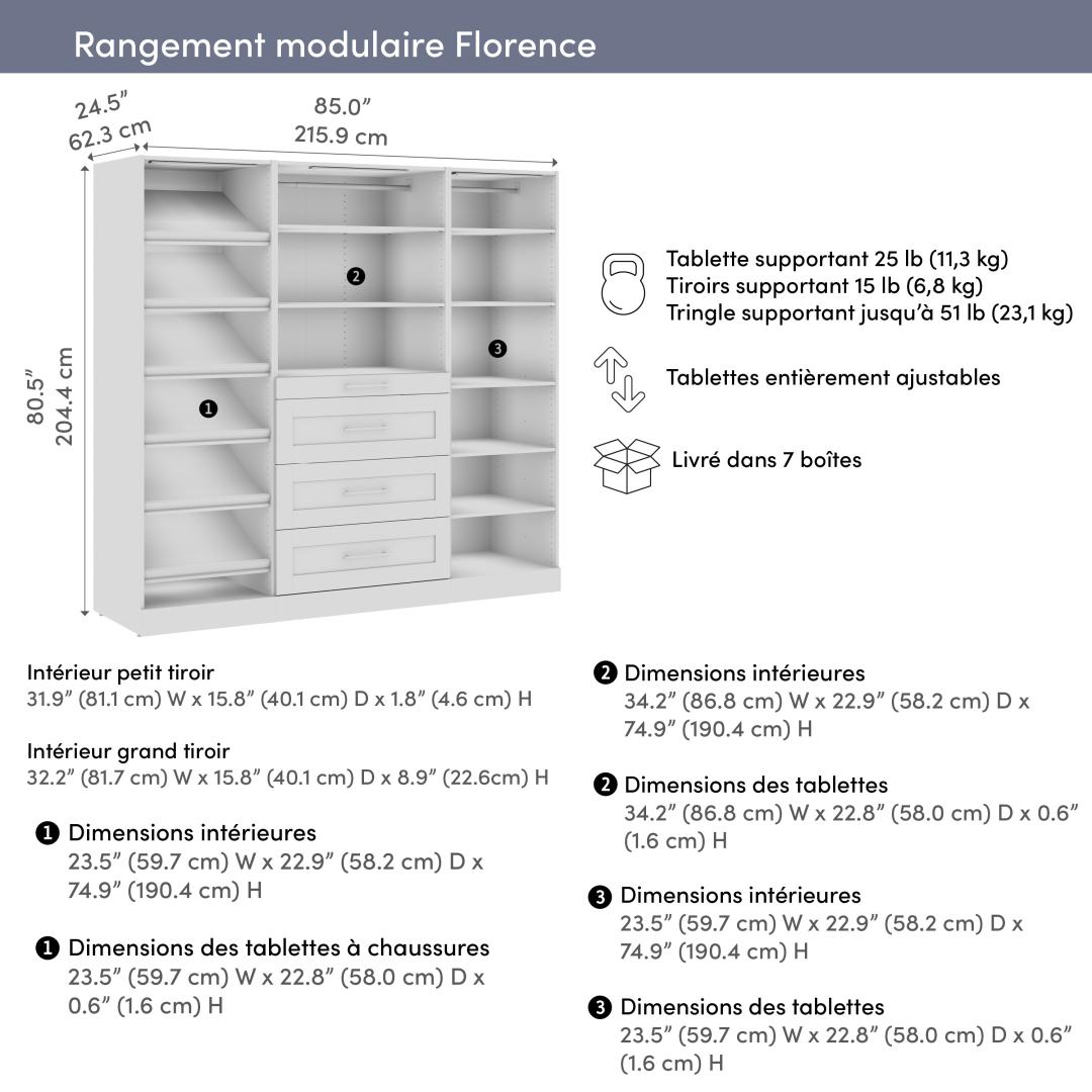 Système de rangement modulaire pour garde-robe walk-in ou placard avec lampes DEL, tiroirs et tablettes à chaussures 85L x 25P, style Shaker
